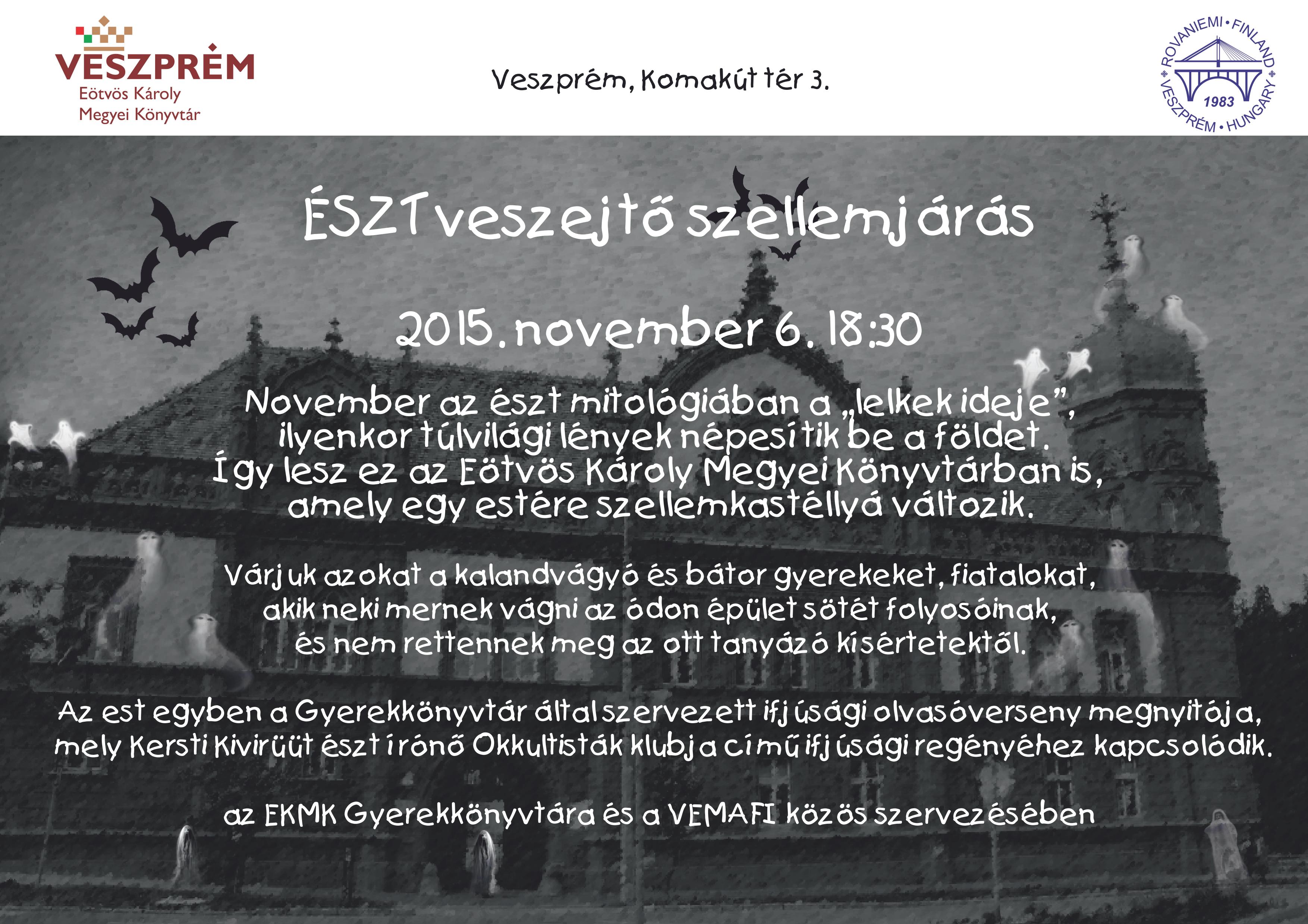2015. november 6-án, pénteken 18.30 órától várjuk azokat a kalandvágyó és bátor gyerekeket, fiatalokat, akik neki mernek vágni az ódon épület sötét folyosóinak és nem rettennek meg az ott tanyázó kísértetektől.
