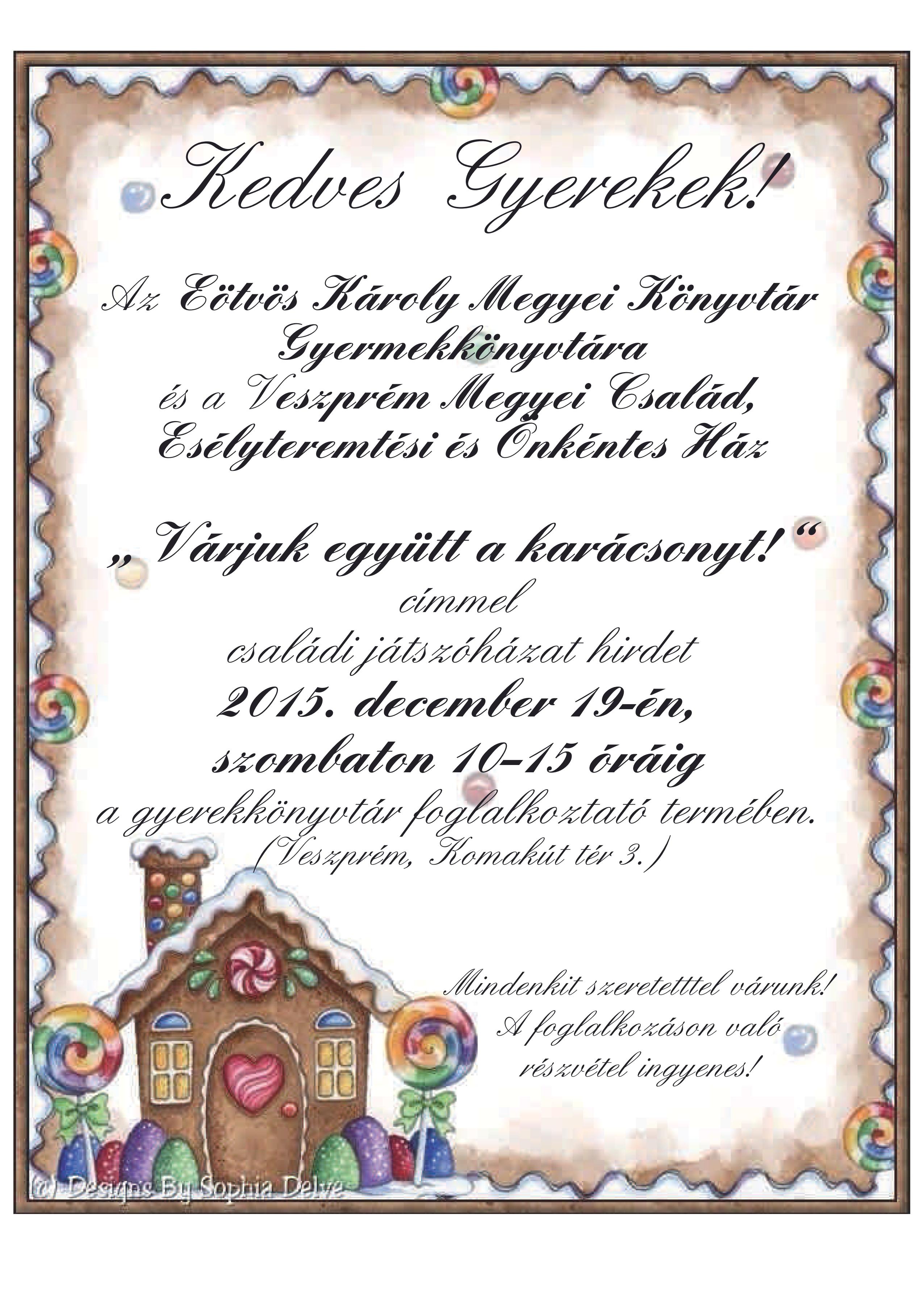 2015. december 19-én, szombaton 10–15 óra között várjuk a gyerekkönyvtár foglalkoztató termébe a családokat játszóházunkba.