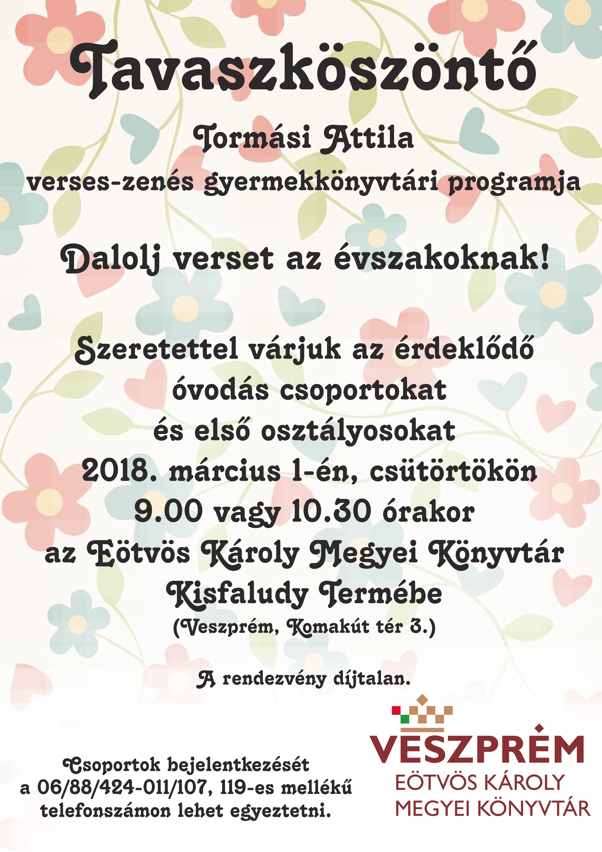 Tormási Attila verses-zenés gyermekkönyvtári programjára várjuk az érdeklődő óvodás csoportokat és első osztályosokat 2018. március 1-én, csütörtökön 9.00 vagy 10.30 órakor a megyei könyvtár Kisfaludy Termébe.