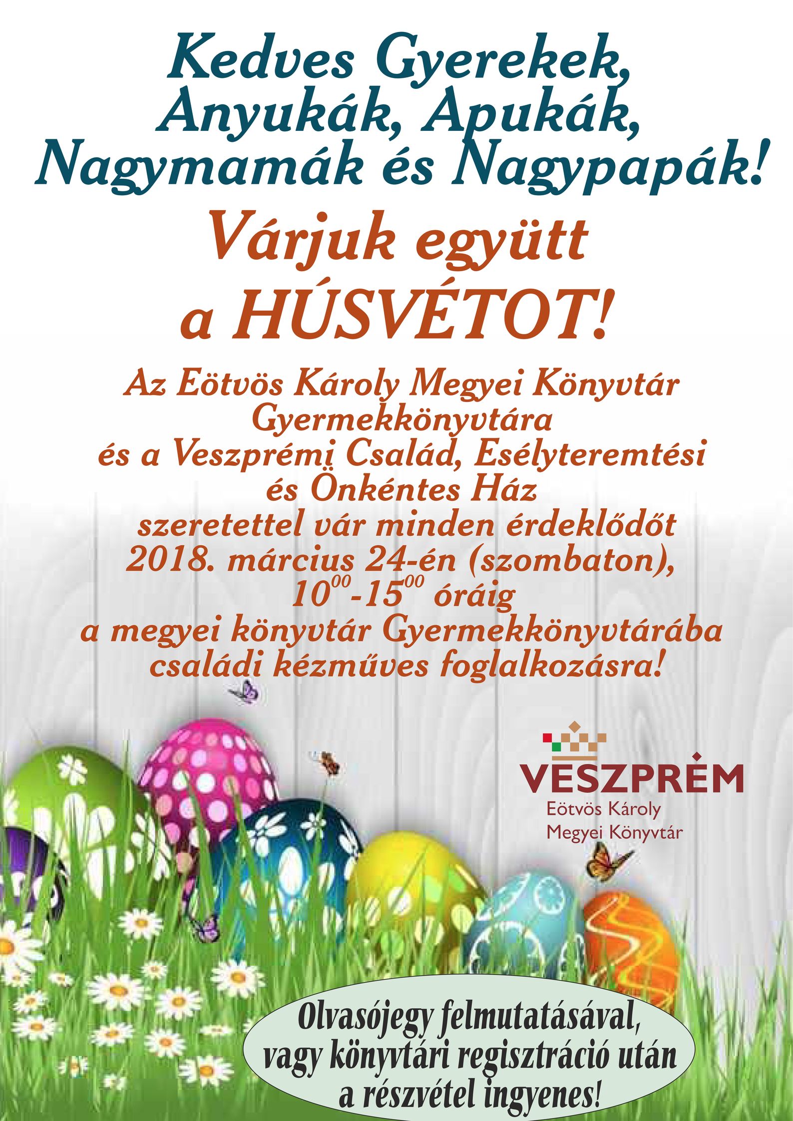 Az Eötvös Károly Megyei Könyvtár Gyermekkönyvtára és a Veszprémi Család, Esélyteremtési és Önkéntes Ház szeretettel vár minden érdeklődőt 2018. március 24-én (szombaton), 10.00-15.00 óráig a megyei könyvtár Gyermekkönyvtárába családi kézműves foglalkozásra!