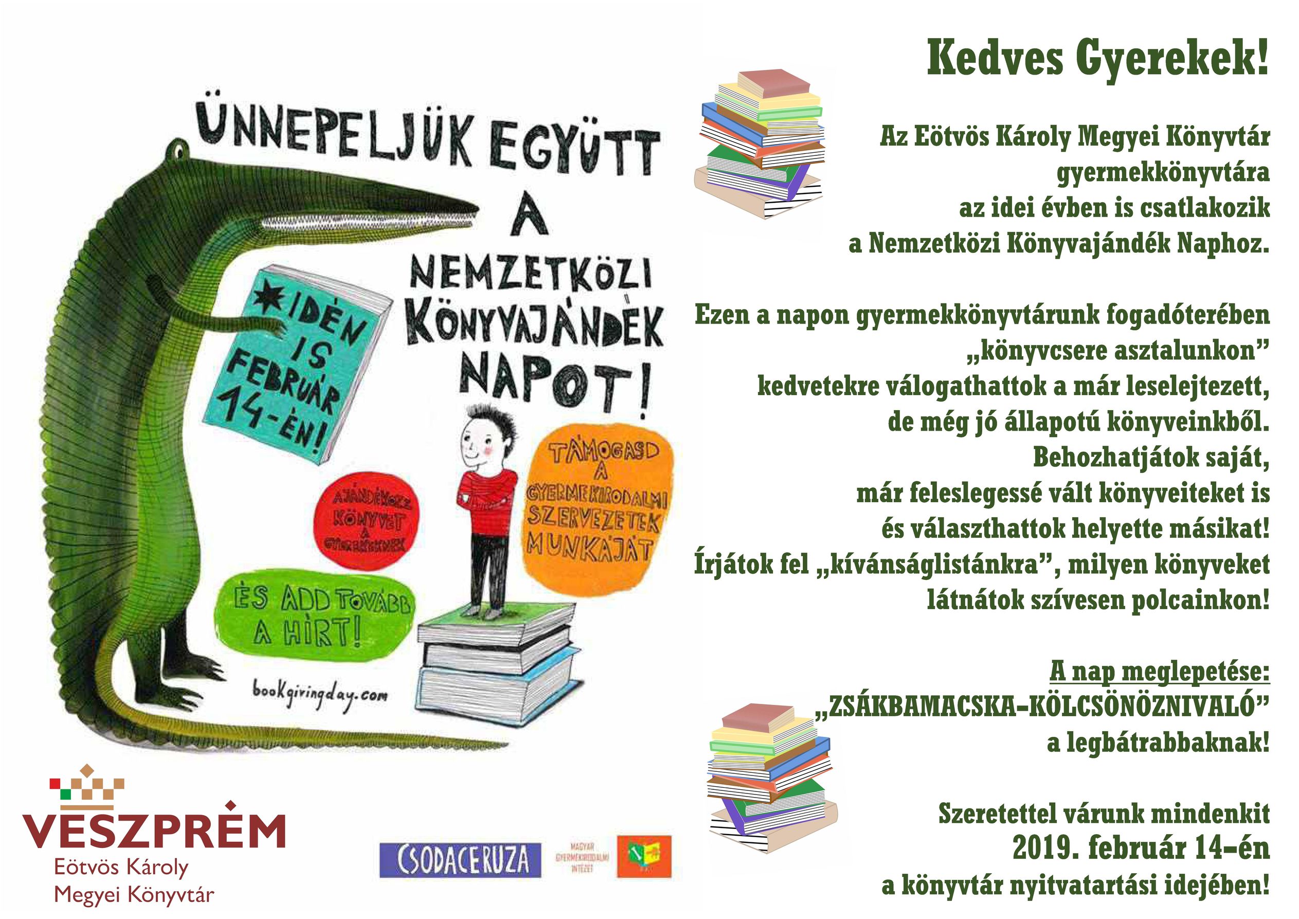 Ezen a napon gyermekkönyvtárunk fogadóterében „könyvcsere asztalunkon” kedvetekre válogathattok a már leselejtezett, de még jó állapotú könyveinkből. Behozhatjátok saját, már feleslegessé vált könyveiteket is és választhattok helyette másikat!