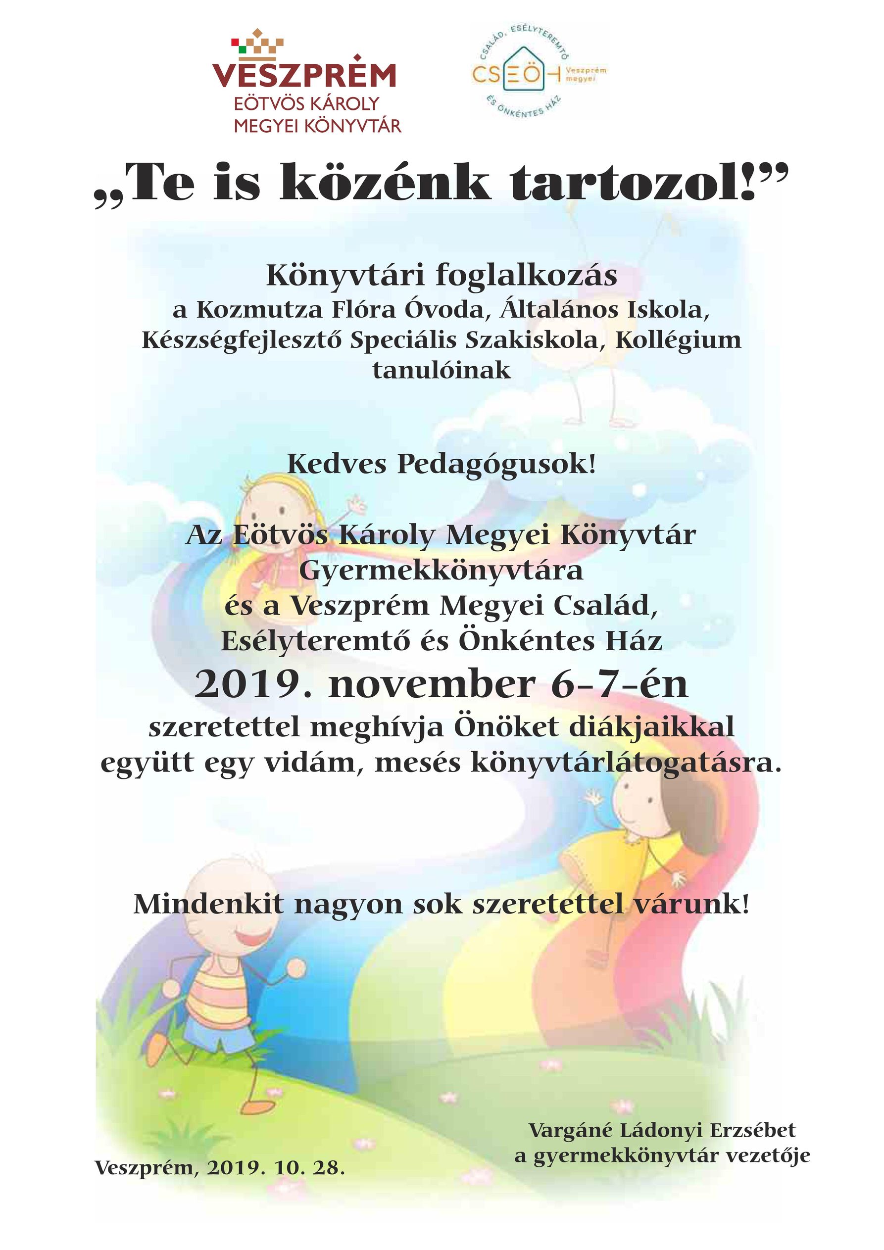 Az Eötvös Károly Megyei Könyvtár Gyermekkönyvtára és a Veszprém Megyei Család, Esélyteremtő és Önkéntes Ház 2019. november 6-7-én szeretettel meghívja Önöket diákjaikkal együtt egy vidám, mesés könyvtárlátogatásra.