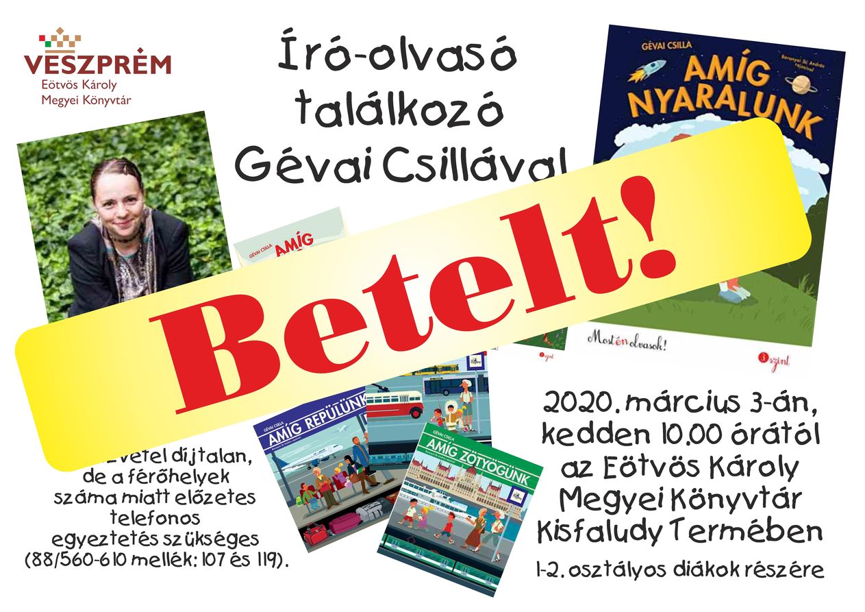Szeretettel várunk minden kedves érdeklődőt Gévai Csilla író-olvasó találkozójára az Eötvös Károly Megyei Könyvtár Kisfaludy Termébe (Veszprém, Komakút tér 3.) 2020. március 3-án, kedden 10 órára.