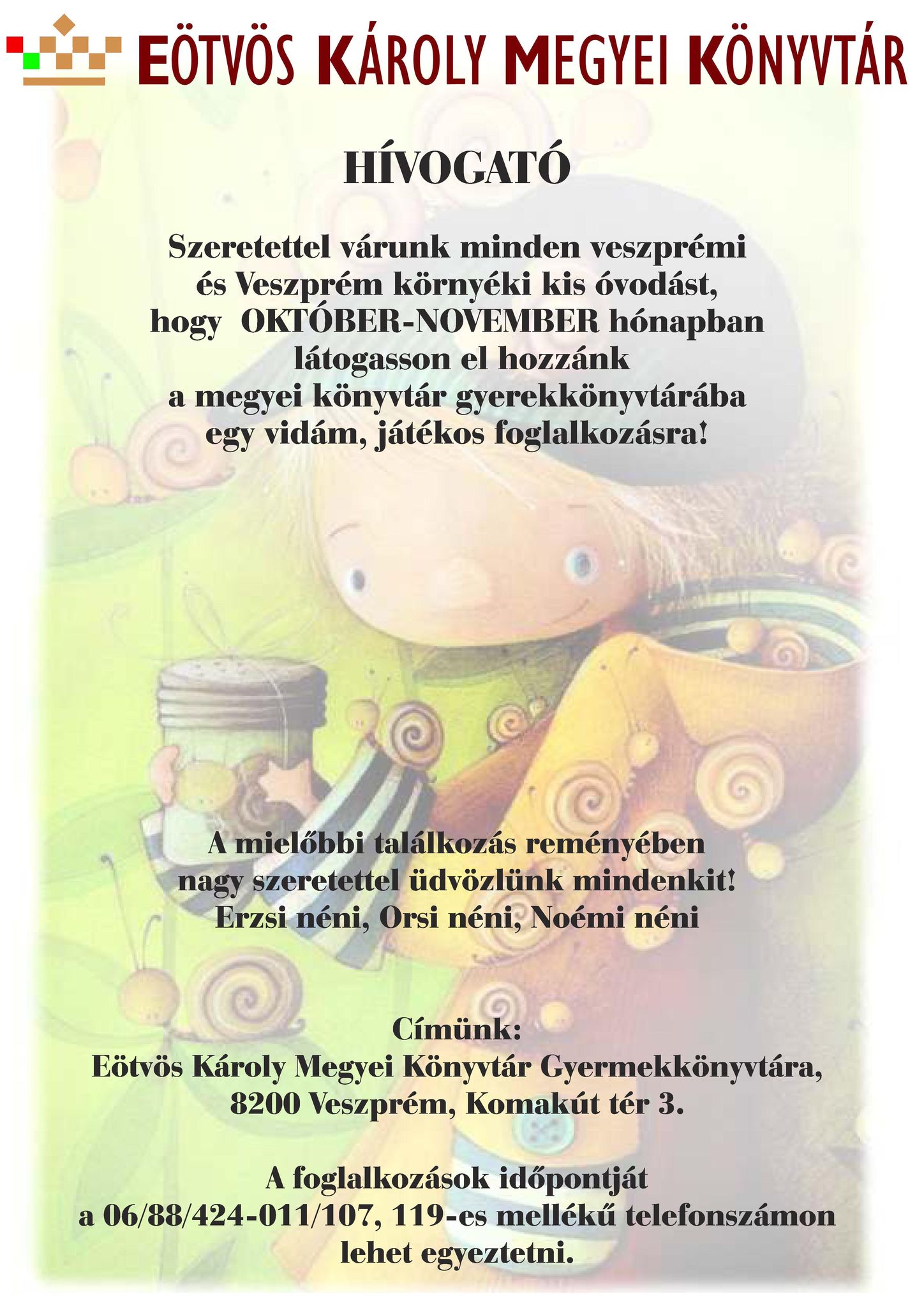 Szeretettel várunk minden veszprémi és Veszprém környéki kis óvodást, hogy OKTÓBER-NOVEMBER hónapban látogasson el hozzánk a megyei könyvtár gyerekkönyvtárába egy vidám, játékos foglalkozásra!